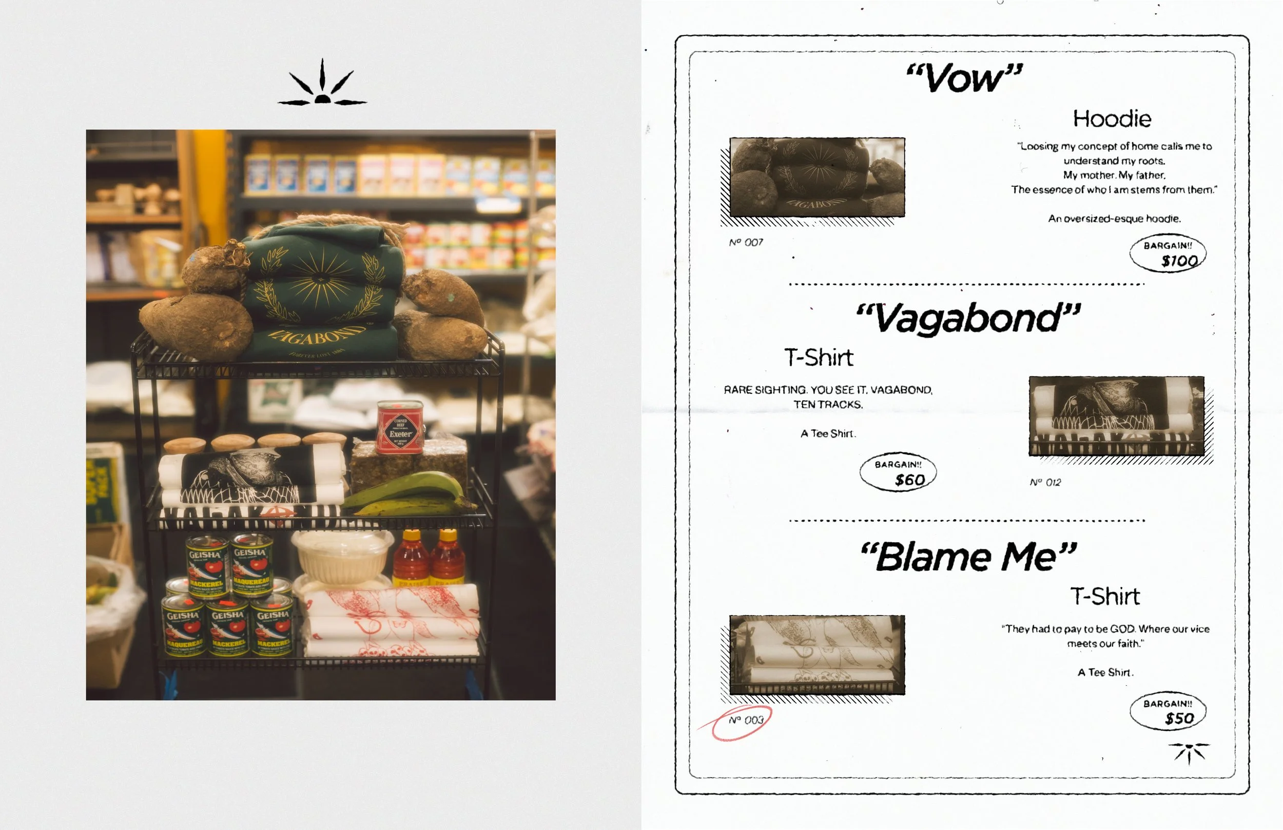 The Vagabond zine was conceptualized with frequent collaborator, friend and artist Hanz alongside Kwabena during a special time when visions were closely aligned. This zine was inspired by the texture of a familiar story that both artists hold dear to their hearts. The story of the resilient Vagabond, defined by losing your ideas of origin in order to create a new reality of home. As children of immigrants, this was something we’re all too familiar with. Capturing this essence was done by tapping into research of past ideas that came before us and channeling it into a tool that has been used to support ourselves and community; commerce.